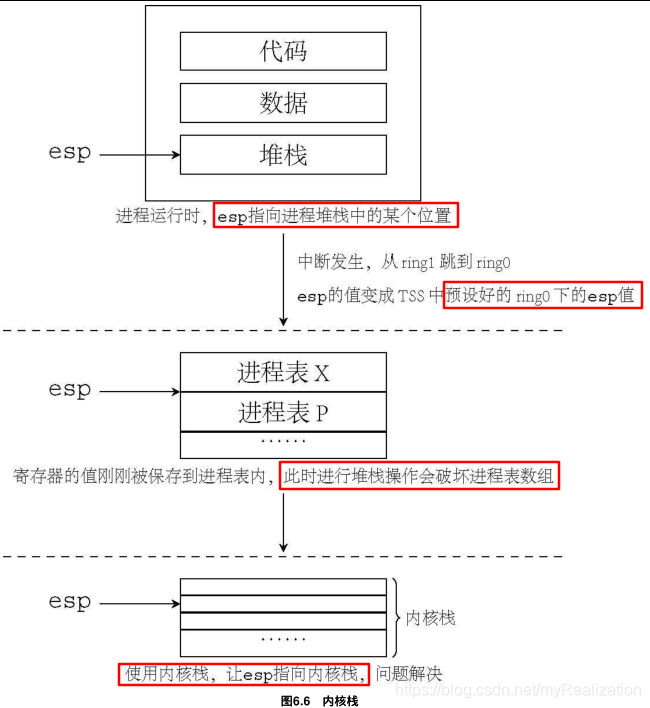 当寄存器的值已经被保存到进程表内,进程调度模块就开始执行。但这时 esp 指向何处?我们在进程调度模块中会用到堆栈,而寄存器被压到进程表之后,esp 是指向进程表某处的。接下来进行任何的堆栈操作,都会破坏掉进程表的值,从而在下一次进程恢复时产生严重的错误。为解决这个问题,必须将 esp 指向专门的内核栈区域。这样,在短短的进程切换过程中,esp的位置出现在3个不同的区域(下图是整个过程的示意)。
